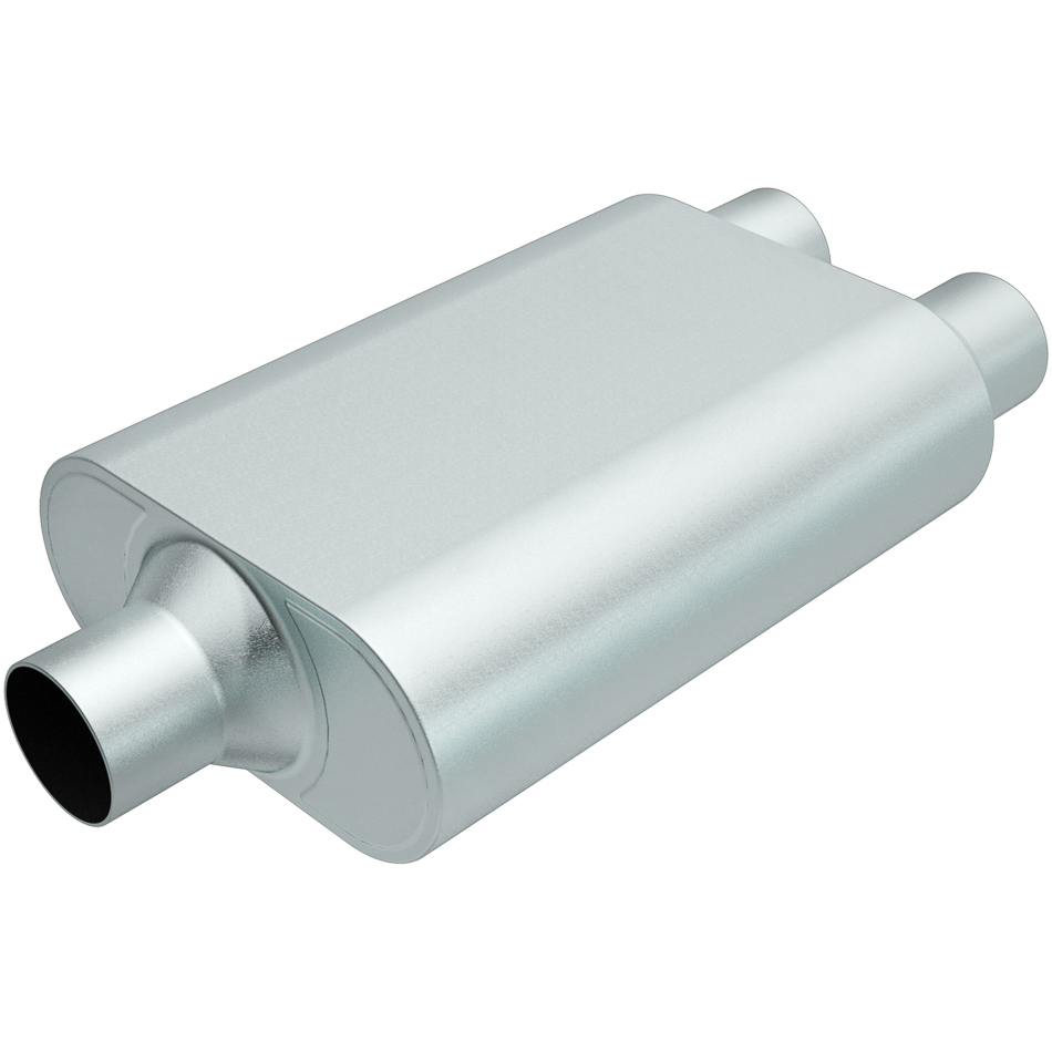 Muffler – Rumble – 3 in Center Inlet – Dual 2.25 in Outlet – 13 x 4.25 x 9.5 in Oval Body – 19 in Long – Steel – Aluminized – Universal – Each