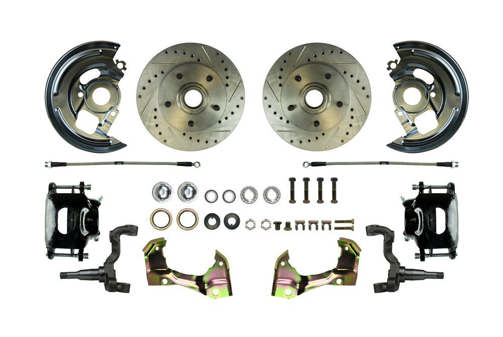 Brake System – Disc Conversion – Front – 1 Piston Caliper – 11.000 in Drilled / Slotted Rotors – Offset Hat – Iron – Black – GM A-Body 1964-72 – Kit